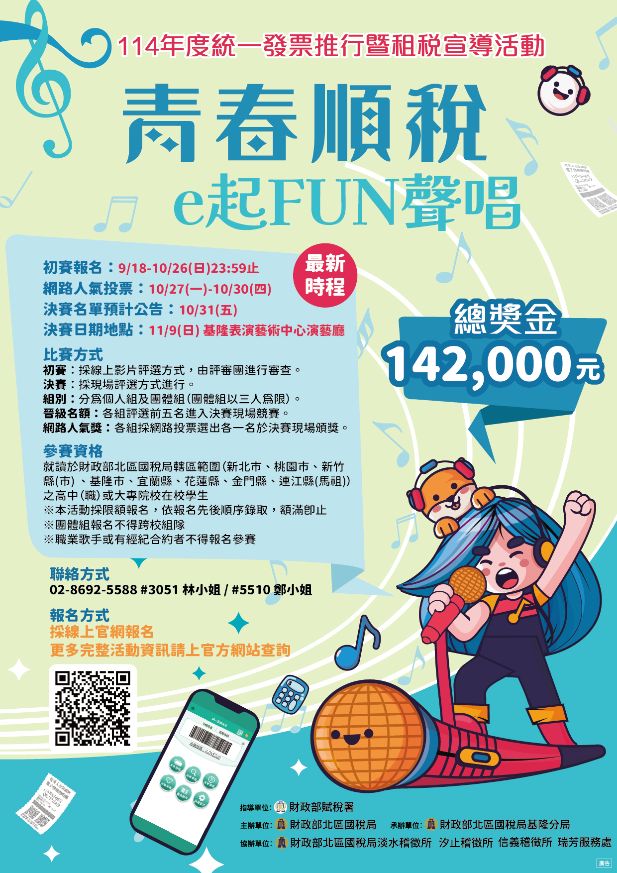 青春順稅 e起FUN聲唱,統一發票推行及租稅宣導活動歌唱比賽初賽,鼓勵學生踴躍參與(初賽報名時間延至114年10月26日止)