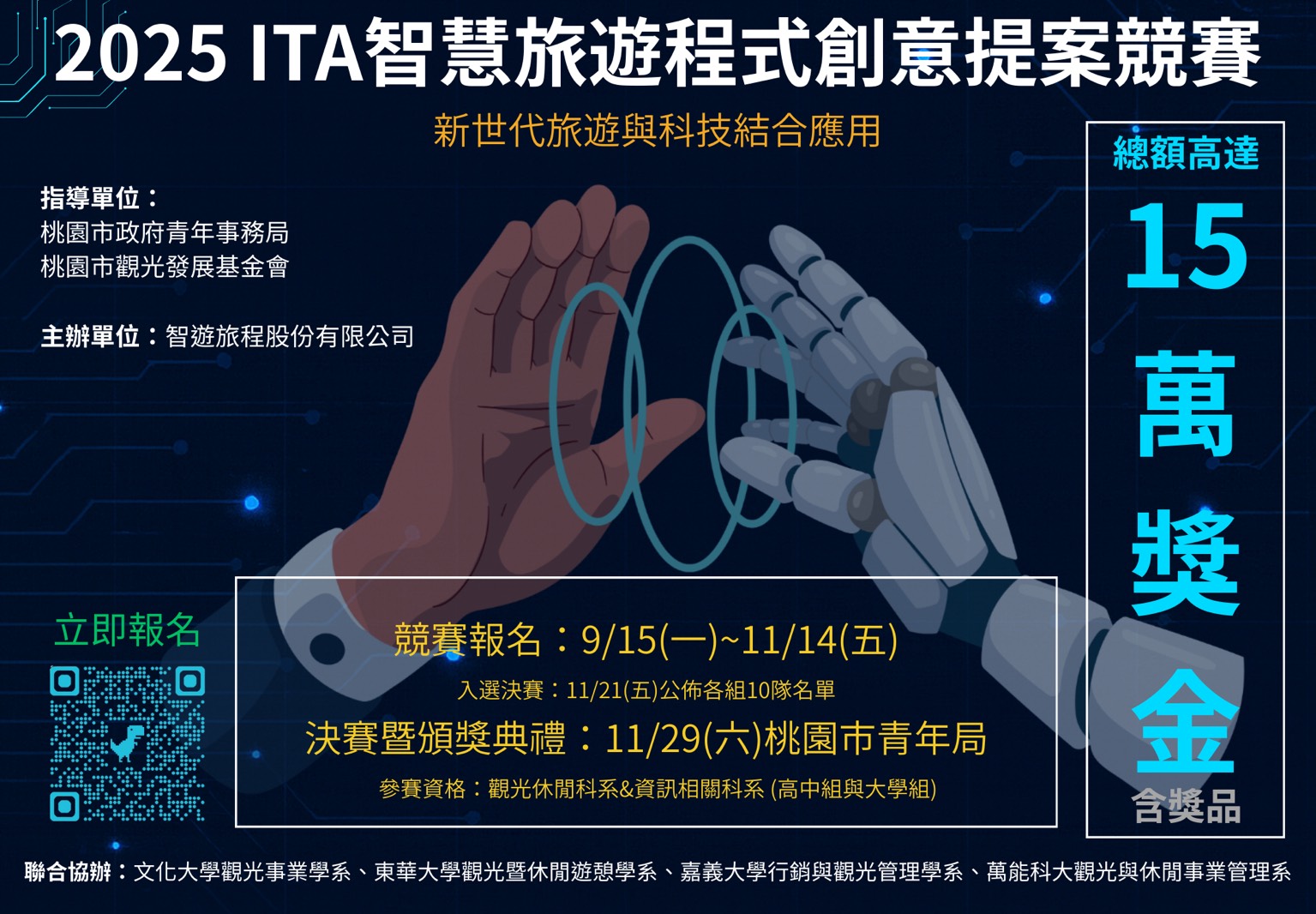 二、前揭活動資訊,摘述如下: (一)報名期限:114年9月15日至114年11月14日止。 (二)參與對象:限觀光休閒及資訊相關科系之大專院校、高中職青年。 (三)活動網址:https://www.tourscombine.com/article/2025092629。 (四)報名方式:請進入活動網址後點選下方「立即報名」按鈕填寫線上表單。 (五)聯絡人:智遊旅程股份有限公司專案小組,電話:(03)2605886,E-mail:ita90560806@gmail.com。 三、為鼓勵我國青年學子運用創意帶動觀光旅遊產業之發展,請貴校惠予協助於官方網站、公佈欄或社群等張貼活動資訊。     瀏覽數     |
