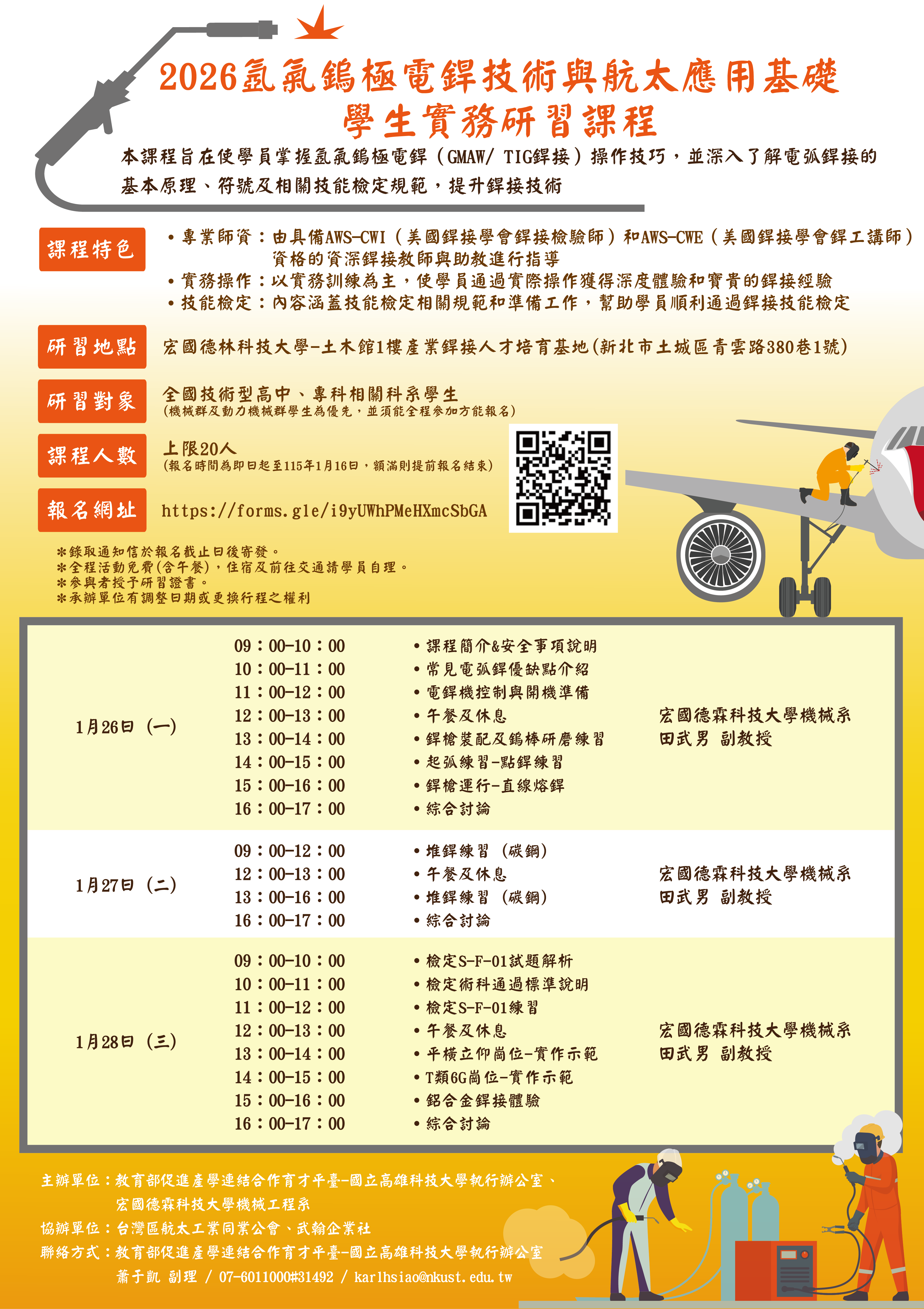 二、課程資訊: (一)課程日期:115年1月26日至1月28日 9:00~17:00。 (二)課程地點:宏國德霖科技大學-土木館1樓產業銲接人才培育基地(新北市土城區青雲路380巷1號)。 (三)課程人數:20人(報名時間為即日起至115年1月16日,額滿則提前報名結束)。 (四)課程對象:全國技術型高中、專科相關科系學生(機械群及動力機械群學生為優先,並須能全程參加方能報名)。 (五)課程方式:實體授課。 (六)報名網址:https://forms.gle/i9yUWhPMeHXmcSbGA (七)全程活動免費(含午餐),住宿與前往交通請學員自理。 (八)全程參與者於課程結束後授予研習證書。 三、活動聯絡人:教育部促進產學連結合作育才平臺-國立高雄科技大學執行辦公室 蕭于凱副理,電話:0 7 -6011000轉31492,電子郵件:karlhsiao@nkust.edu.tw。
