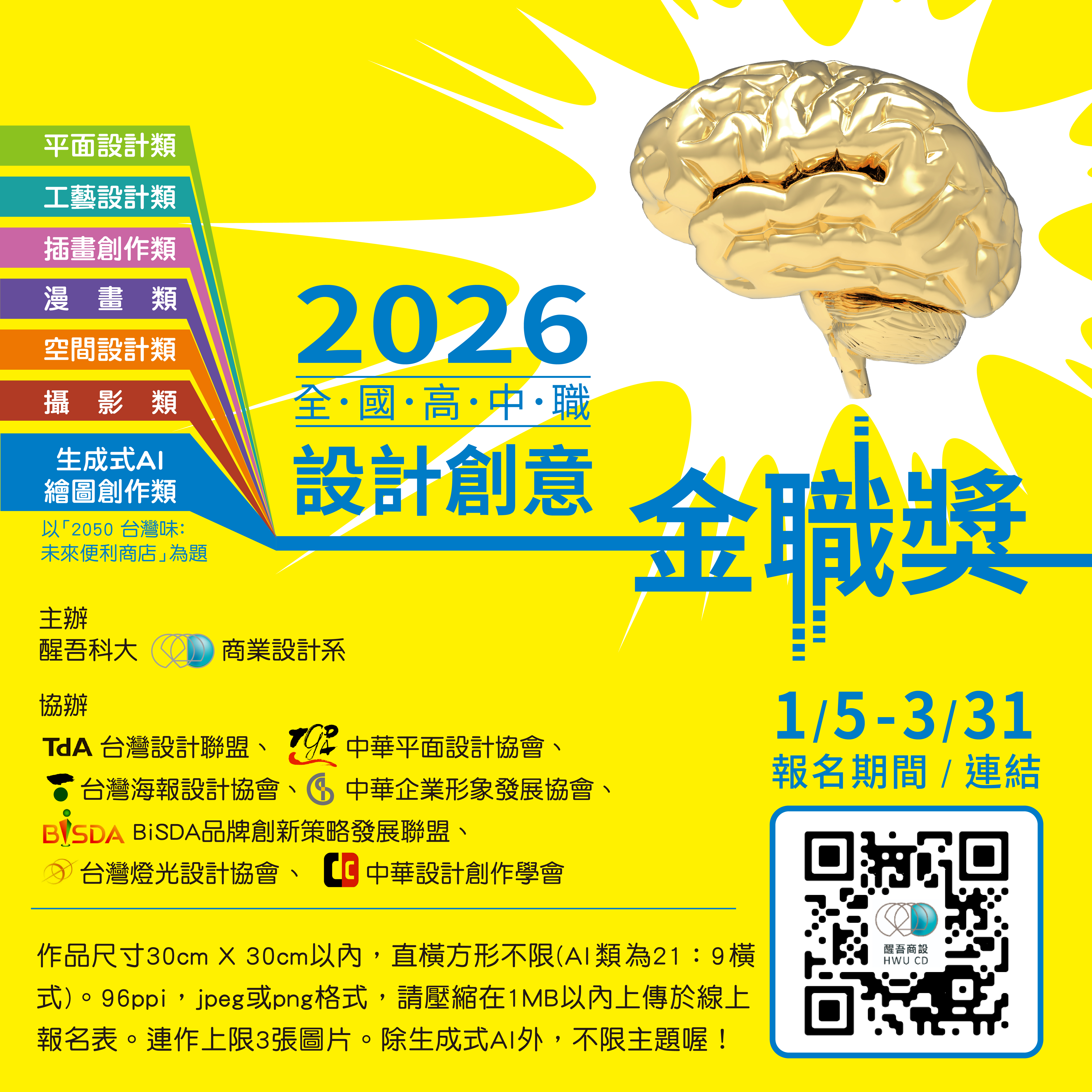 二、主辦單位:醒吾科技大學商業設計系;協辦單位:TdA台灣設計聯盟、中華平面設計協會、台灣海報設計協會、中華企業形象發展協會、中華設計創作學會、BiSDA品牌創新策略發展聯盟、台灣燈光設計協會。 三、競賽共分七大類別:(一)平面設計類、(二)工藝設計類、(三)插畫創作類、(四)漫畫類、(五)空間設計類、(六)攝影類、(七)生成式AI繪圖創作類。 四、報名時間及方式:收件期間自2026年1月5日9:00起,至3月31日23:59截止。報名者須於期限前,將設計圖或作品照片上傳於線上報名網址:https://reurl.cc/qrxmA3,逾期恕不受理。 五、為使同學們瞭解參加競賽的秘訣,以及提昇作品完成度、精緻度,本次特邀請具有豐富經驗的老師辦理寒假衝刺營,歡迎學生踴躍報名參加。 六、檢附詳細競賽簡章、競賽海報及實作營海報等相關電子檔。