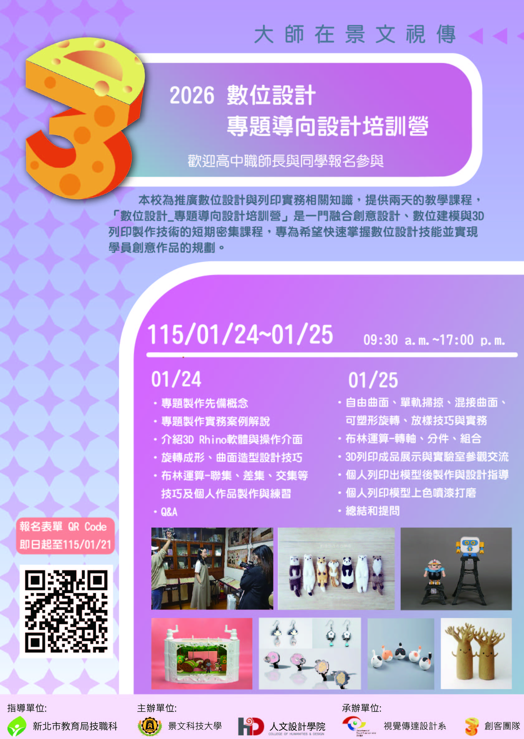 二、活動資訊如下: (一)主辦單位:景文科技大學 視覺傳達設計系。 (二)活動時間:115年1月24日(六)至1月25日(日)共兩日。 (三)活動名額:40人(實體上課人數),依照報名先後次序錄取。 (四)參加對象:設計相關科系之學生或教師。 (五)報名時間:即日起至115年1月21日(三),額滿為止。 (六)報名方式:請以線上填寫google 表單報名https://reurl.cc/EbY1R1。 (七)上課方式:採實體並具有遠距同步服務,如需遠距請在報名表內註明清楚。 (八)活動聯絡人:視覺傳達設計系 楊文灝老師 E-mail:whyang@just.edu.tw 電話:(02)8212-2000#6868 三、補充說明: (一)歡迎貴校二、三年級學生,特別是進行專題商品製作之學生報名參加。 (二)本活動全程免費,並提供高階3D列印設備輸出設計物。 (三)課程特別邀請業界資深專家廖瑞堂教授擔任講師與本系數位設計實務專長的楊文灝老師授課,機會難得,敬請把握。 (四)本活動不提供住宿及交通接送,請參與師生自理。